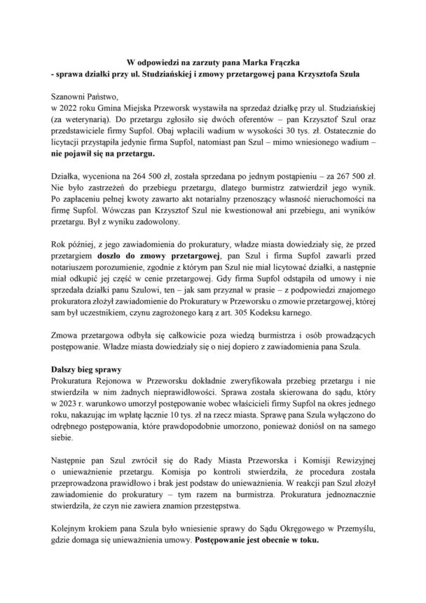 W odpowiedzi na zarzuty pana Marka Frączka – sprawa działki przy ul. Studziańskiej i zmowy przetargowej pana Krzysztofa Szula.