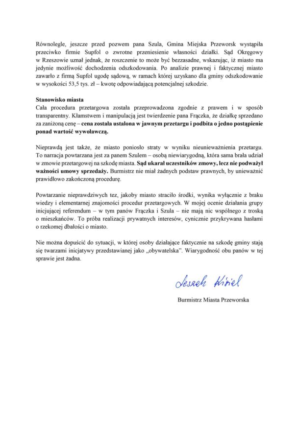 Nieprawdą jest także, że miasto poniosło straty w wyniku nieunieważnienia przetargu. To narracja powtarzana jest za panem Szulem – osobą niewiarygodną, która sama brała udział w zmowie przetargowej na szkodę miasta. Sąd ukarał uczestników zmowy, lecz nie podważył ważności umowy sprzedaży. Burmistrz nie miał żadnych podstaw prawnych, by unieważnić prawidłowo zakończoną procedurę.